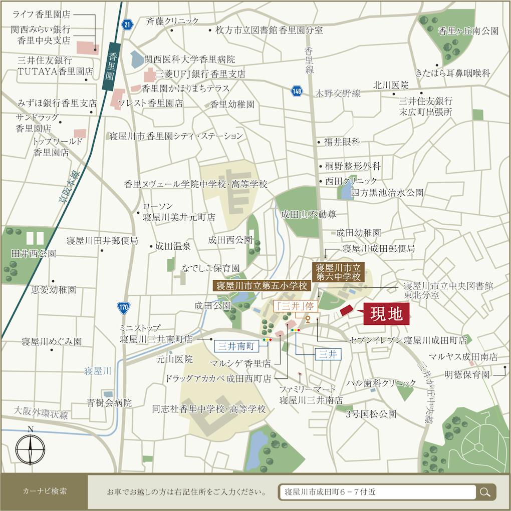 | 交通 | 京阪本線「香里園」駅まで自転車6分 京阪バス「三井」停まで徒歩4~5分、京阪バス「京阪香里園」停までバス乗車9分、京阪本線「香里園」駅まで徒歩2分 |