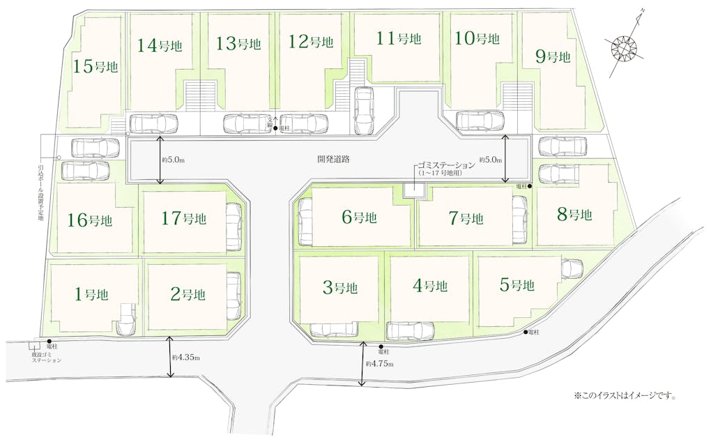 | 道路幅員 | 南側公道約4.35m~4.75m、開発道路5.0m |